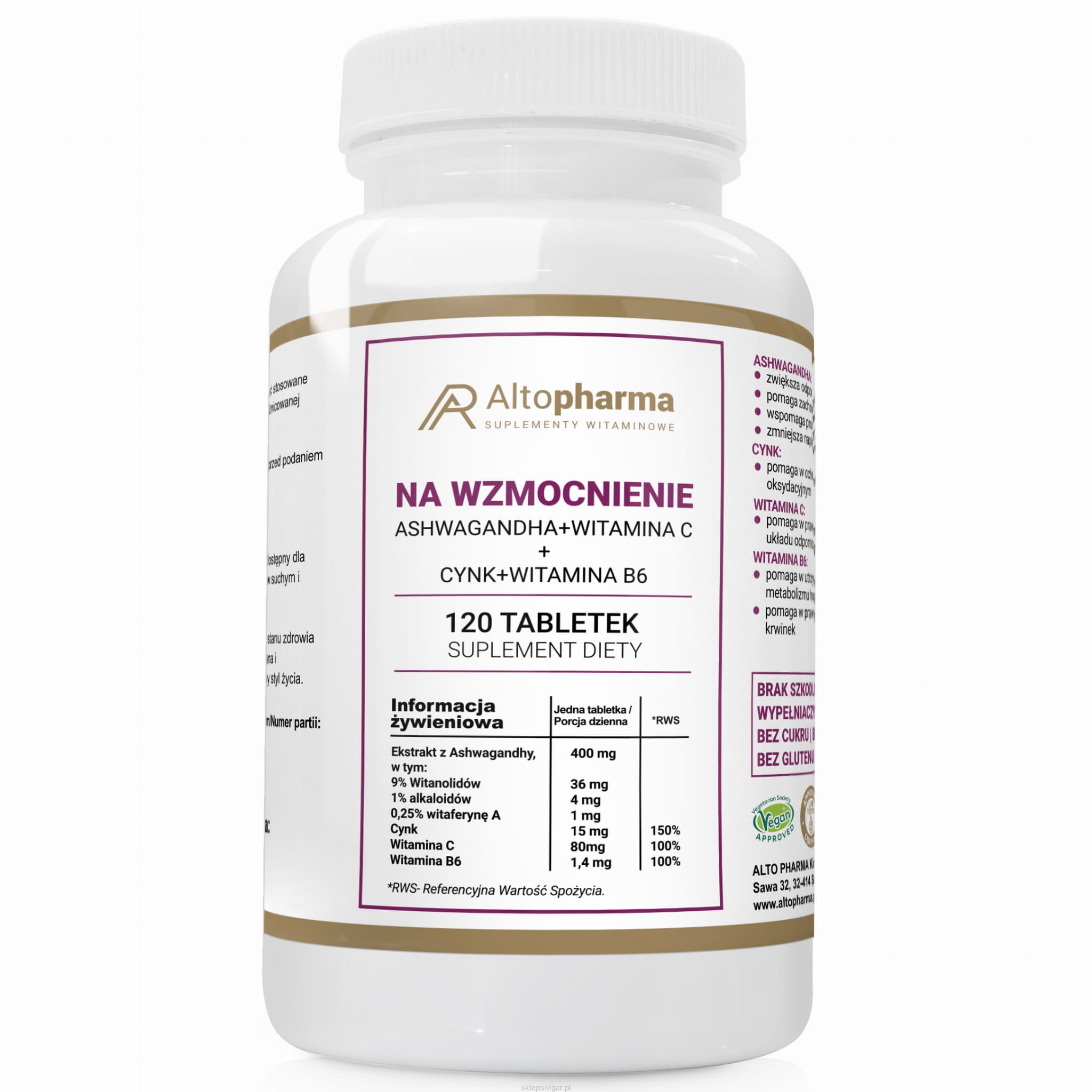 Alto pharma NA WZMOCNIENIE Ashwagandha + Cynk + Witamina C+ Witamina B6 120 tabletek