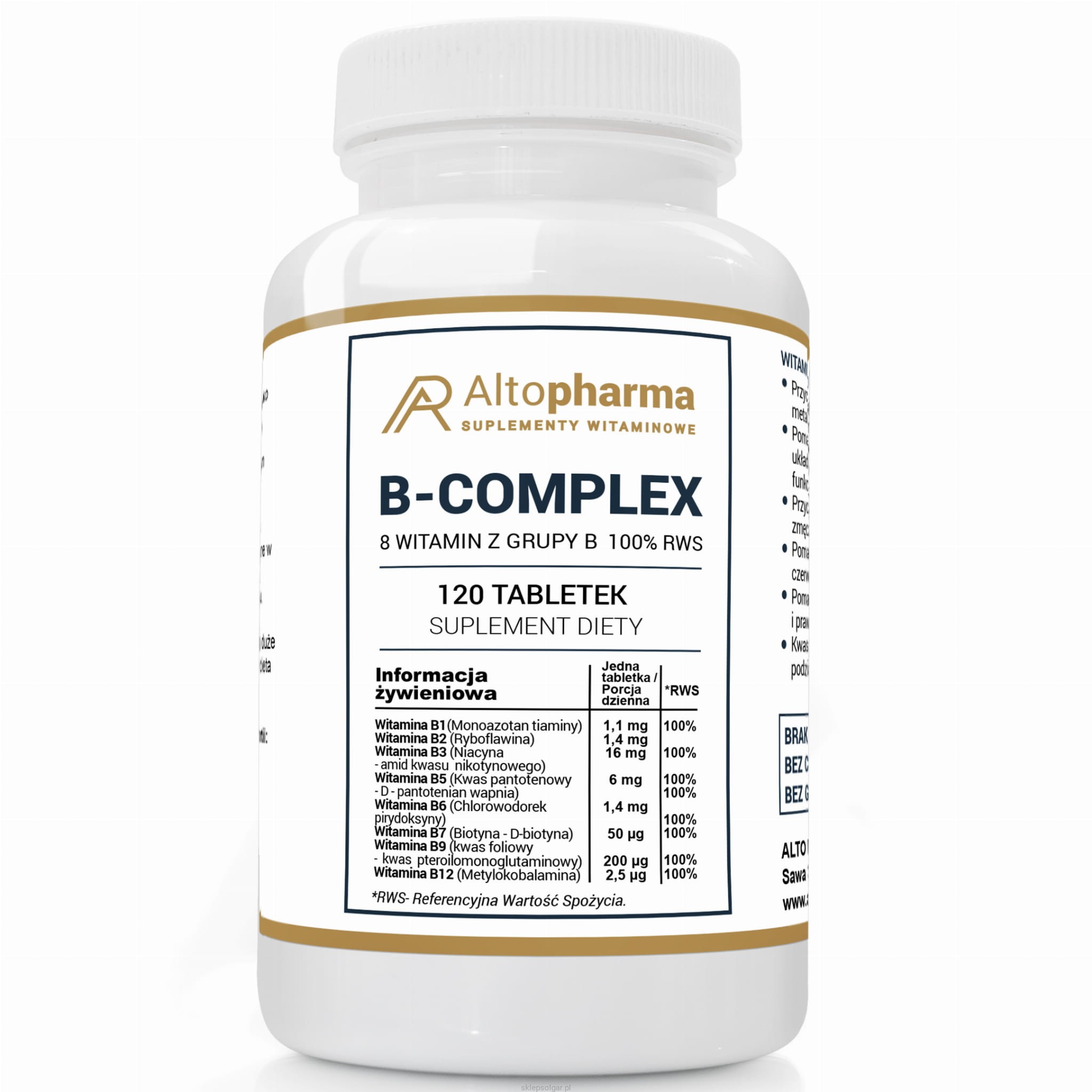 - DAWKA 100% RWS - Jedna tabletka marki Altopharma® pokrywa 100% dziennego zapotrzebowania przeciętnej osoby dorosłej (8400 kJ/2000 kcal) na witaminy z grupy B.