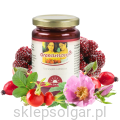 Składniki: koncentrat soku z granatu (koncentrowany próżniowo, częściowo przefermentowany), sok z owocu dzikiej róży, cukier trzcinowy, woda różana, wyciąg z winogron, aromat naturalny – ekstrakt waniliowy, kwas cytrynowy, substancja żelująca – pektyna owocowa, przyprawy, substancja słodząca – glikozydy stewiolowe.