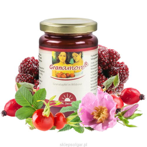 GranAmore to gęsty syrop uzyskany z granatów dojrzałych w słońcu południowych krajów i dzikiej róży. GranAmore to czysta przyjemność i zdrowie. Świetnie nadaje się na miłe rozpoczęcie dnia, jako składnik zdrowego śniadania, na podwieczorek, czy zawsze wtedy, kiedy masz chętkę na coś słodkiego. Na 100g produktu zużyto 120g owoców – 80g granatów i 40g róży. Są one bogate w składniki ważne dla zdrowia i witalności, w tym witaminę C. Koncentrat z granatu został częściowo przefermentowany, więc zawarte w nim polifenole świetnie się wchłaniają. Swoją słodycz GranAmore zawdzięcza wyciągowi z róży, trzciny cukrowej i liści stewii.