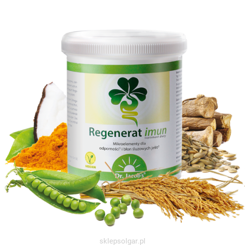 Błona jelita podlega nieustannej regeneracji i potrzebuje do tego dużych ilości składników odżywczych. Regenerat imun zawiera kompleks takich składników: kwasy tłuszczowe Omega-3, łatwoprzyswajalne aminokwasy, lecytynę słonecznikową, mikroelementy i cenne składniki z roślin, w szczególności kurkuminoidy. Naturalne aromatyczne olejki eteryczne, lukrecja i dodatek glikozydów stewiolowych, nadają produktowi przyjemny smak. Kompleks aminokwasów stanowi doskonałe uzupełnienie diety wegańskiej.
