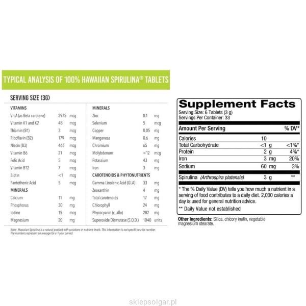 Skład w porcji dziennej (6 tabletek): spirulina pacifica 3 g