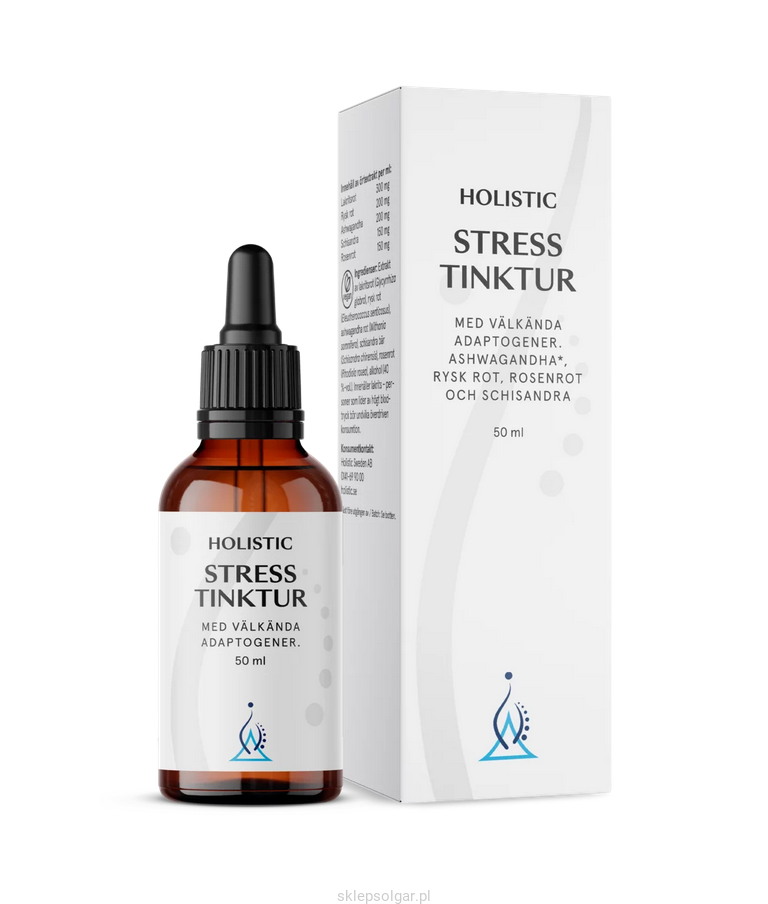 Holistic Stress tinktur jest suplementem diety w postaci płynnego wyciągu ziołowego zawierającego lukrecję, eleuterokoka kolczastego, ashwagandhę, cytryńca chińskiego i różeńca górskiego, które mają właściwości adaptogenne.