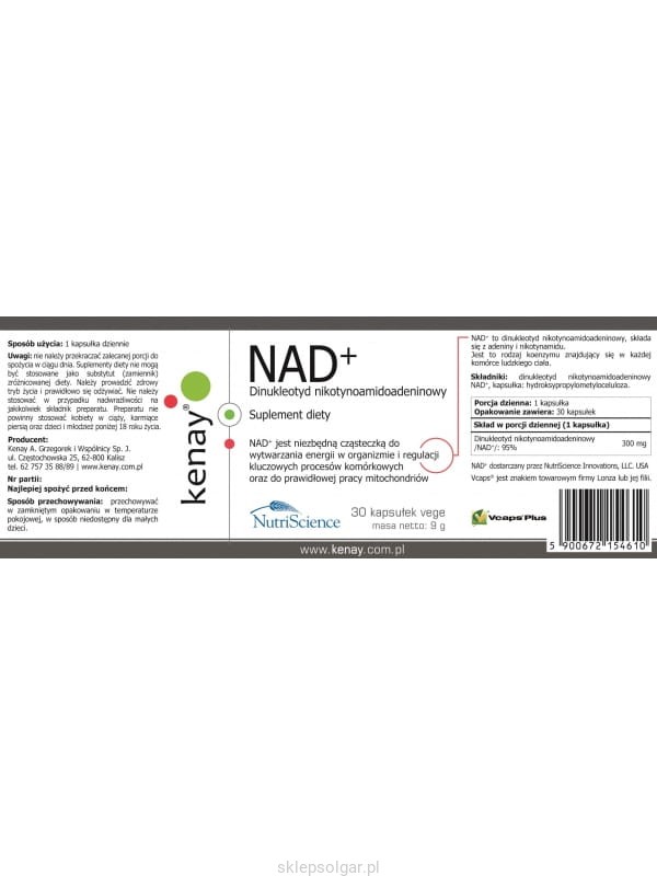 Składniki: dinukleotyd nikotynoamidoadeninowy NAD+; kapsułka: hydroksypropylometyloceluloza.