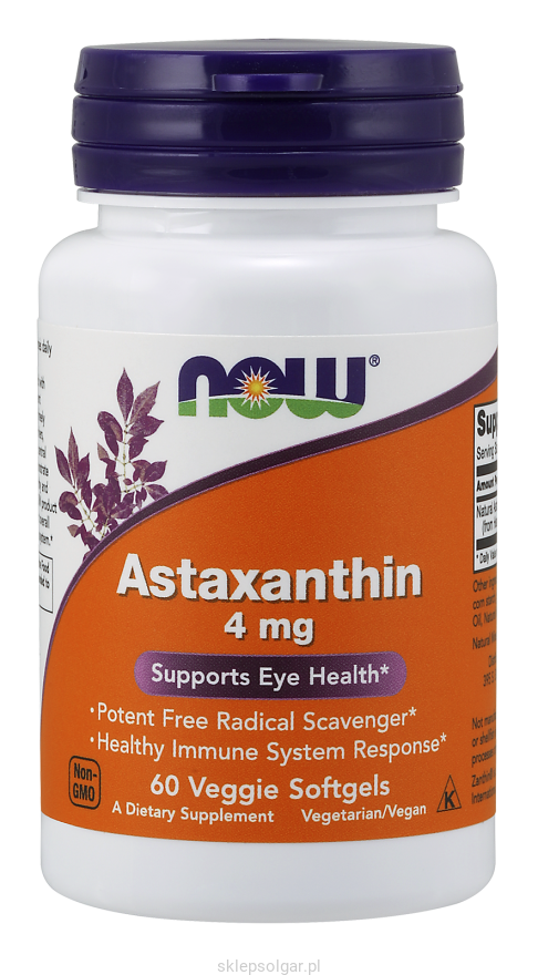 Astaxanthin 4 mg marki NOW® (astaksantyna) to naturalnie występujący karotenoid o unikalnej strukturze – swobodnie przekracza bariery: krew–mózg oraz krew–siatkówka i może neutralizować wolne rodniki w oku oraz w centralnym układzie nerwowym. Ten produkt marki NOW zawiera preparat Zanthin®, który może pomóc w utrzymaniu zdrowia oczu i sprzyja zdrowiu układu nerwowego.