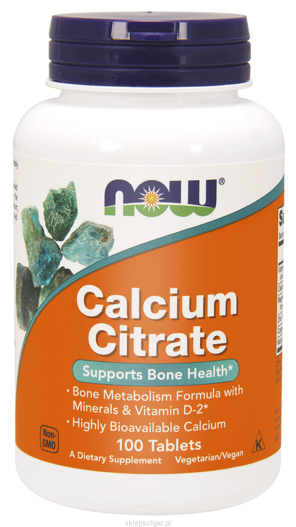 Calcium Citrate Tablets marki NOW® zawiera łatwiej trawioną i lepiej przyswajalną formę wapnia wraz z innymi minerałami o działaniu wspierającym układ kostny. Wapń przyczynia się do prawidłowego krzepnięcia krwi; pomaga w prawidłowym funkcjonowaniu mięśni; utrzymaniu prawidłowego przewodnictwa nerwowego; jest potrzebny do utrzymania zdrowych kości i zdrowych zębów. Magnez pomaga w prawidłowym funkcjonowaniu układu nerwowego; utrzymaniu prawidłowych funkcji psychologicznych, zdrowych kości i zdrowych zębów. Cynk pomaga w utrzymaniu prawidłowych funkcji poznawczych, prawidłowej syntezie DNA i utrzymaniu zdrowych kości. Witamina D pomaga w utrzymywaniu prawidłowego poziomu wapnia we krwi; prawidłowym wchłanianiu wapnia i fosforu; utrzymaniu zdrowych kości, zdrowych zębów; prawidłowym funkcjonowaniu mięśni i układu odpornościowego. Mangan przyczynia się do utrzymania zdrowych kości, pomaga w prawidłowym tworzeniu tkanek łącznych. Miedź pomaga w utrzymaniu prawidłowego stanu tkanek łącznych, przyczynia się do utrzymania prawidłowego metabolizmu energetycznego, pomaga w prawidłowym transporcie żelaza w organiźmie.