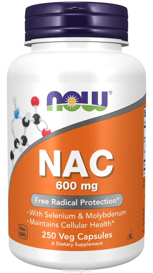 NAC 600 mg marki NOW® to kompleks zawierający stabilną postać aminokwasu L-cysteiny w połączeniu z selenemoraz molibdenem. L-cysteina to aminokwas zawierający siarkę. który działa jako stabilizator do tworzenia struktur białkowych. a także jest niezbędny do tworzenia glutationu. Molibden i selen są niezbędnymi pierwiastkami śladowymi. które ułatwiają produkcję kilku ważnych enzymów. Selen przyczynia się do prawidłowego przebiegu spermatogenezy. pomaga zachować zdrowe włosy. zdrowe paznokcie. Ponadto selen pomaga w prawidłowym funkcjonowaniu układu odpornościowego oraz tarczycy. Molibden przyczynia się do utrzymania prawidłowego metabolizmu aminokwasów siarkowych.