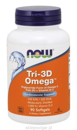 Tri-3 D Omega marki NOW® zawiera naturalny koncentrat oleju rybiego z zawartością nienasyconych kwasów tłuszczowych Omega-3: DHA, EPA. Kwasy EPA i DHA przyczyniają się do prawidłowej pracy serca oraz pomagają w utrzymaniu prawidłowego poziomu trójglicerydów we krwi. Naturalny koncentrat oleju rybiego stosowany w tym produkcie wytwarzany jest zgodnie ze ścisłymi normami kontroli jakości. Zostało przetestowane, aby nie zawierało potencjalnie szkodliwych poziomów zanieczyszczeń (tj. rtęci, metali ciężkich, PCB, dioksyn i innych zanieczyszczeń).
