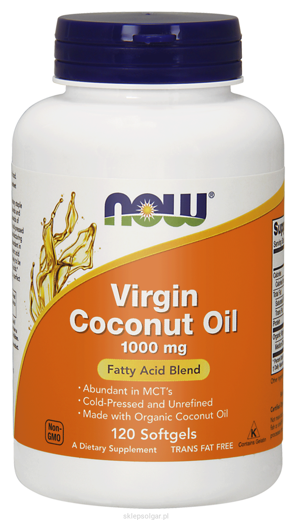 Virgin Coconut Oil 1000 mg marki NOW® (olej z kokosa) jest olejem odżywczym i tradycyjnym, podstawowym pożywieniem ludności Azji, Afryki oraz wysp Oceanu Spokojnego. Od tysięcy lat jest stosowany w tradycyjnym zielarstwie ajurwedycznym. Virgin Coconut Oil marki NOW® to nierafinowany, tłoczony na zimno olej, który pozyskano bez użycia jakichkolwiek rozpuszczalników. Olej kokosowy nie zawiera tłuszczów trans i jest bogaty w trójglicerydy kwasów tłuszczowych średniołańcuchowych (MCT’s), takich jak kwas laurynowy (C-12) oraz kwas kaprylowy (C-8). Trójglicerydy kwasów tłuszczowych średniołańcuchowych (MCT’s) mają mniejszą tendencję do gromadzenia się w organizmie w formie tłuszczu niż większość pozostałych kwasów tłuszczowych. W połączeniu z niezbędnymi nienasyconymi kwasami tłuszczowymi stanowią doskonały dodatek do pełnego programu zdrowych lipidów.