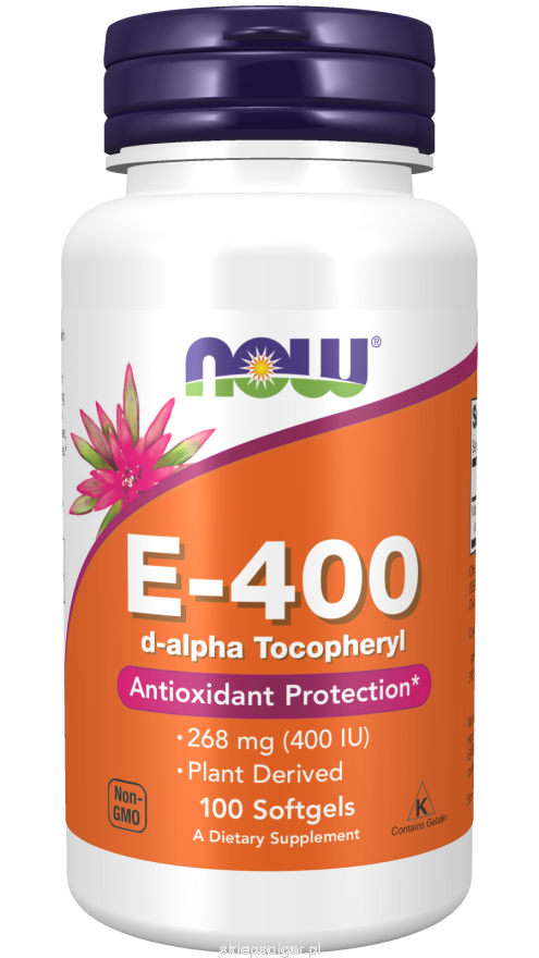 E-400 Natural marki NOW® zawiera naturalną witaminę E – ważny przeciwutleniacz i pierwszą linię obrony przeciwko peroksydacji lipidów. Ma szczególnie istotne znaczenie dla ochrony komórek organizmu przeciw uszkodzeniom spowodowanym przez wolne rodniki (oksydacyjnym).