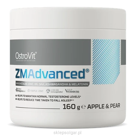 OstroVit ZMAdvanced to kompleksowy suplement diety, który zawiera sześć różnych substancji, m.in. ekstrakt z korzenia ashwagandhy czy kwas D-asparaginowy. To preparat o pysznym, jabłkowo-gruszkowym smaku, dostępny w wygodnej formie proszku. To produkt stworzony z myślą o sportowcach i osobach, którym zależy na prawidłowej regeneracji organizmu.