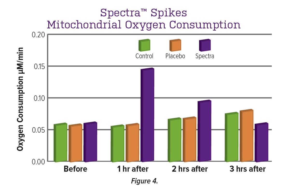 Tlen to kluczowy składnik dla życia człowieka. Odpowiada za setki zadań w organizmie, a jednym z najważniejszych jest produkcja energii. Wytwarzanie energii w organizmie odbywa się poprzez połączenie glukozy z tlenem, które skutkuje wytworzeniem cząsteczek ATP, będących podstawowym nośnikiem energii na poziomie komórkowym. Wolne rodniki są produktem ubocznym tej konwersji. Produkcja wolnych rodników może powodować lokalne stany zapalne, co można zaobserwować szczególnie podczas ćwiczeń fizycznych – powstające wtedy wolne rodniki mogą powodować stany zapalne w mięśniach, doprowadzając do ich uszkodzenia. Wykazano, że Spectra ™ zmniejsza bezpośrednią korelację między zwiększonym zużyciem tlenu i produkcją wolnych rodników poprzez zwiększenie komórkowego (Wykres 3) i mitochondrialnego (Wykres 4) zużycia tlenu, przy jednoczesnym zminimalizowaniu powstawania wolnych rodników (ROS). Uzyskane wyniki sugerują poprawę wydajności funkcji komórkowych w organizmie.