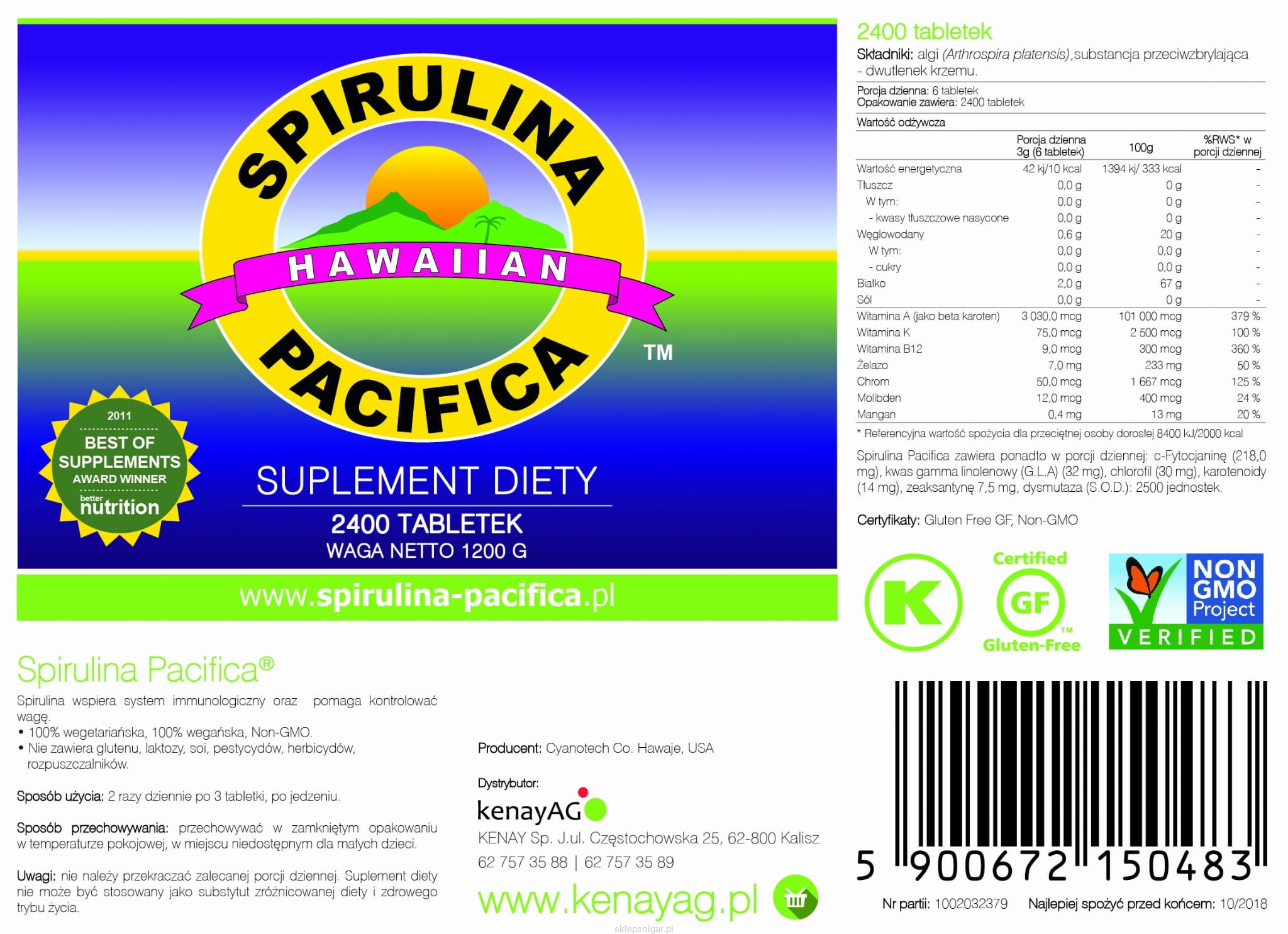 - hawajska spirulina Pacifica posiada wszystkie możliwe międzynarodowe certyfikaty jakościowe (m.in. ISO9002 i certyfikat koszerności) oraz certyfikaty bezpieczeństwa stosowania jakie są dostępne na świecie,