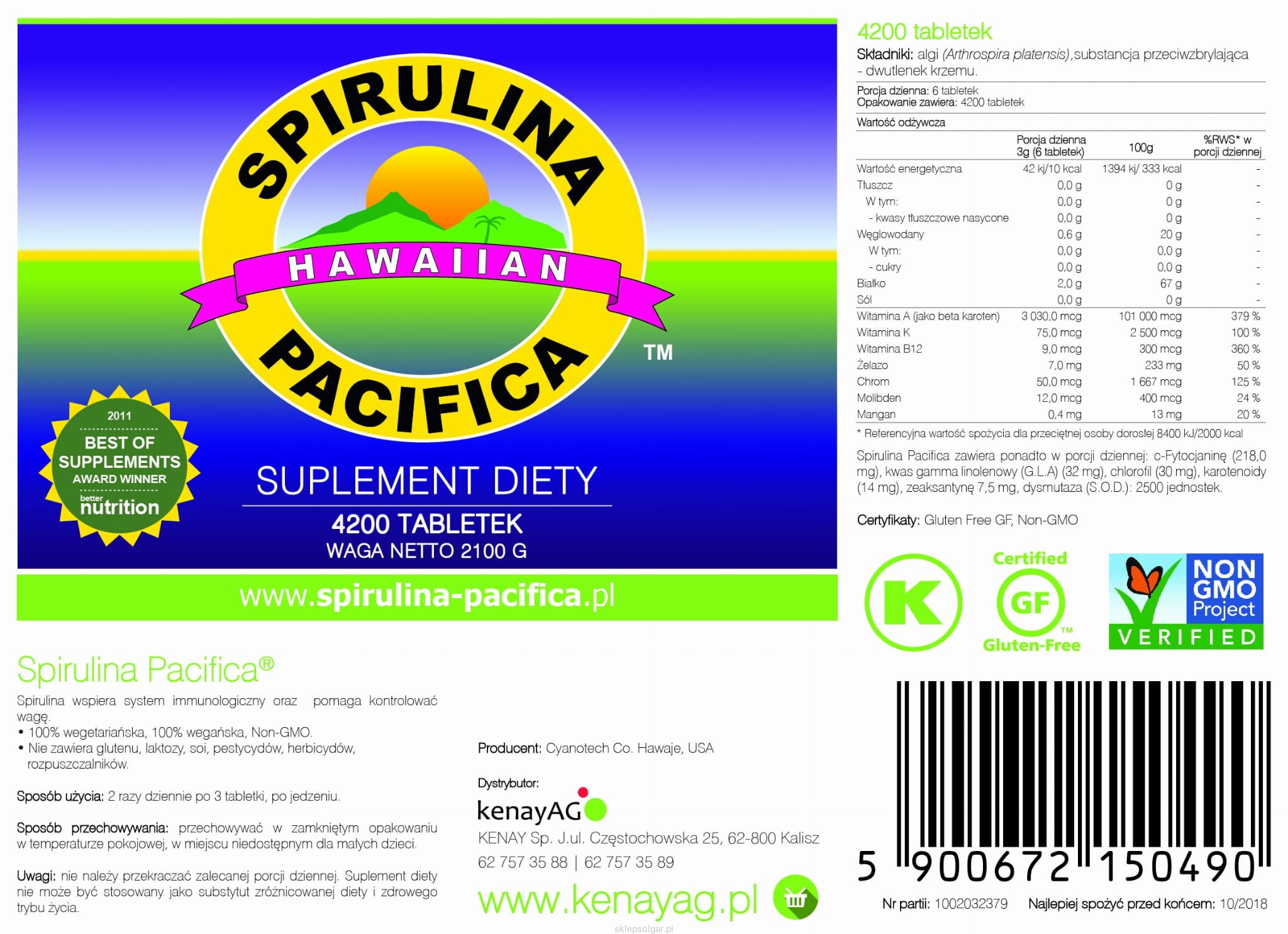 - hawajska spirulina Pacifica posiada wszystkie możliwe międzynarodowe certyfikaty jakościowe (m.in. ISO9002 i certyfikat koszerności) oraz certyfikaty bezpieczeństwa stosowania jakie są dostępne na świecie,